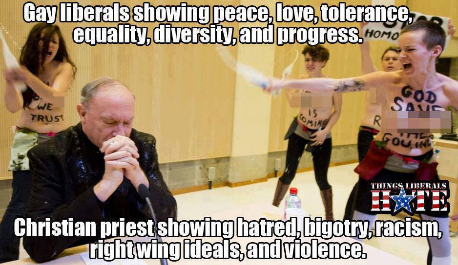 N’est-il pas ridicule de la part des catholiques d’adopter les mêmes méthodes de communication que ceux qui les attaquent ? Aux mèmes athées, on riposte par les mèmes religieux. Aux Femens, on répond par les Hommen entr’aperçus lors des manifestations en France et, plus récemment, par les Antigones, vestales chrétiennes plus douces que les hystériques topless mais qui pratiquent la contestation en appartement.