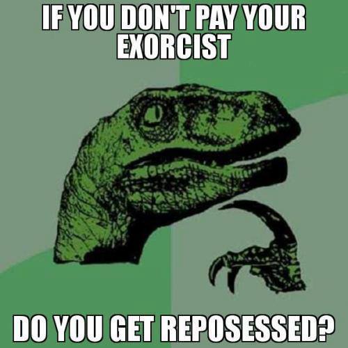 Pour ceux qui l’ignoreraient, les mèmes se composent d’un visuel et d’un texte, et ils se caractérisent par leur répétition et leur viralité. Les mèmes constituent un vocabulaire restreint dans lequel tout le monde peut piocher, chaque visuel devenant une idée – un sentiment – qu’il vous est possible d’appliquer à tout sujet. Ici, l’un des mèmes les plus célèbres, le Philosoraptor, appliqué à l’exorcisme :