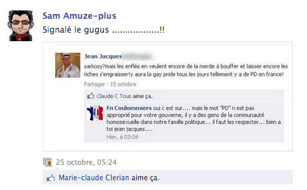 Mieux, l’utilisation de la capture d’écran permet de dénoncer des gens ayant proféré des insultes sur leur page. Ceux-ci sont moqués sous leurs vrais noms et les membres du groupe son invités à signaler cette personne pour qu’elle soit excommuniée de facebook. La dénonciation se fait bien sûr sous pseudonyme, dans la plus pure tradition délatrice :
