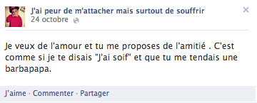 Facebook est-il un lieu où l’on peut trouver le réconfort ? On peut en tout cas s’y plaindre, et on le remarque souvent lorsque d’anciens possesseurs de Skyblog se frayent un chemin dans votre friendlist. Cette page est consacrée à des appels à l’aide sans réponse de désespoir, entrecoupé de publicité pour des coupons :