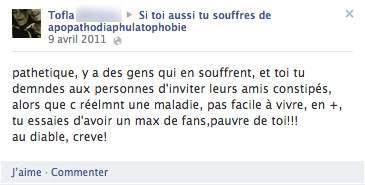 Une autre page tente le même thème, ici, avec plus de succès, mais la demande du modérateur “d’inviter ses amis constipés” ne plaît pas à tout le monde :