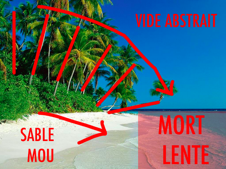 Le sable clair, choisi pour son aspect livide et nuageux ressemble à un lit dans lequel le dormeur pourra se glisser suavement, la mer devenant soudain une couverture. En somme, le rêve moderne est une plage-dortoir, vide d’être humain, symbole codé de la mort lente. Une plage concentrationnaire. Oui, le Tryangle l’affirme : la plage, c’est la mort. En voici, décrypté l’insoupçonnable géométrie du déclin :
