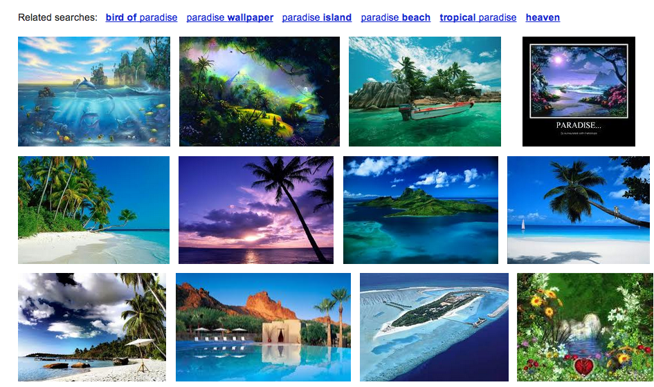 Voici ce qu’ont obtenu les chercheurs en internetomancie du Tryangle lorsqu’ils ont tapé le mot anglais “paradise” dans le moteur de recherche Google image. Quelle ne fut pas leur surprise… L’esthétique Edenique de l’Ancien Testament a, semble-t-il, cédé la place à un imaginaire d’agence de voyage, quelque part entre le fond d’écran Windows 95 et la peinture du Douanier Rousseau. Le terme paradis, mot d’origine avestique, qui avait traversé le persan, le grec et le latin, subit ici une mutation de type “phase terminale”. Et, contrairement à l’idée initiale du grec “paradeisos” qui signifiait un parc clos où se trouvent des animaux sauvage, la vision occidentale moderne du paradis se fige sur le bord de mer ouvert, et dans un lieu lointain. Pourquoi ?