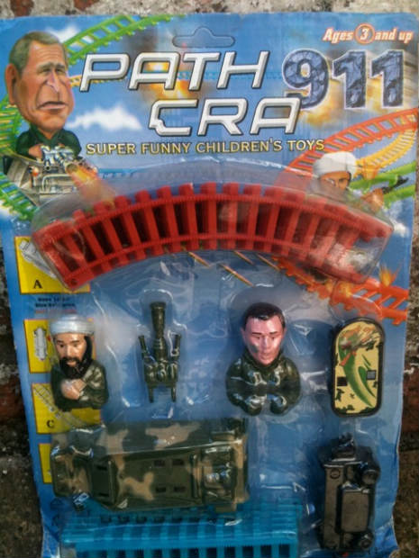 Pourquoi vos enfants continueraient-ils à jouer à la police et aux voleurs ? Grâce au 911 Path Cra, le nom du jouet ici présenté, vous pouvez sensibiliser votre enfant aux enjeux géopolitiques du monde moderne. Fabriqué en Chine et vendu au Maroc, ce jouet représente le duel entre Georges W. Bush et Oussama Ben Laden. Comme vous pouvez le voir en haut de cet image, 4 pièces de plastiques rouges permettent à votre enfant de constituer un manège de chemin de fer, une image forte de la vacuité de la guerre pour votre marmot qui comprendra la vie avant même d’avoir lu Guerre et Paix.