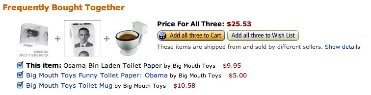Dans la même veine poétique, le papier toilette Osama est l’outil de ceux qui ne souhaitent pas abandonner la lutte le temps d’aller là où le roi va seul. De véritables combattants en somme. Chose amusante, selon Amazon, les personnes aimant s’essuyer le derrière avec le visage d’Osama aime faire de même avec le visage de Barack Obama, tout en buvant leur café dans un mug en forme de toilette. Le Tryangle n’est pas parvenu à obtenir leur adresse mail à ce jour :