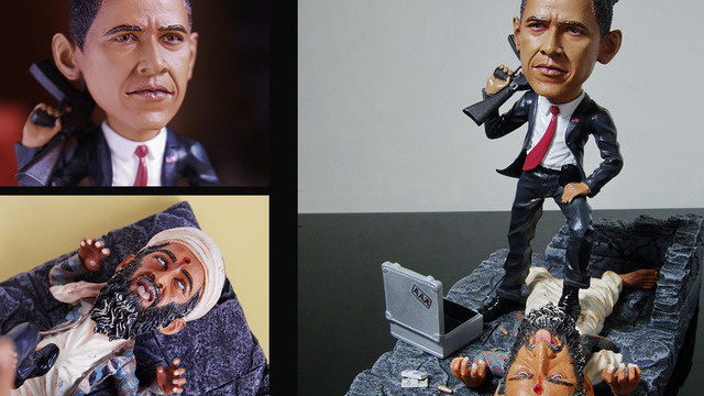 Bien sûr, la gloire d’avoir vaincu Oussama est, pour les américains, une source de plaisir relativement forte, comme en témoigne cette collection de T-shirt à col en V (for Victory) et cette statuette d’Obama triomphant :