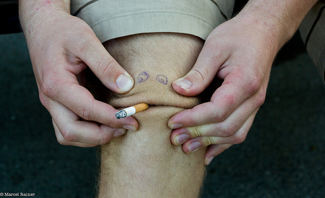 La solution la plus simple consiste à bannir toute ambition. Voici le mode d’emploi. Attendez que quelqu’un vous pose la question fatidique : «Quelles sont vos bonnes résolutions ?». Soyez bien sûr qu’il s’agisse de cette question et non de «Peux-tu me passer le sel ?» ou «Comment va ta femme ?», questions au demeurant sympathiques mais qui n’ont rien à voir. A ce moment, répondez “Fumer par le genou”. Pour ce faire, retroussez votre pantalon, plissez la peau du genou après avoir tendu la jambe (pour disposer d’un bout de peau) et plantez-y une cigarette. Si vous voulez vraiment bien commencer l’année, vous pouvez dessiner deux yeux au-dessus – rires garantis –
