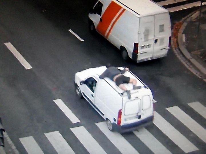La réponse : il va jusque sur le toit de sa camionnette que viennent de lui subtiliser les deux bandits. C’est le parisien qui rapporte ce fait étrange et agrémenté de photographies captées par les caméras de surveillance :