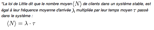 La théorie des files d’attente est une théorie mathématique du domaine des probabilités. Elle consiste en l’étude de la gestion optimale des files d’attente, ou queues. De nombreux mathématiciens ont ainsi conçu des algorithme pour modéliser les queues, par exemple, la loi de Little ( comme par hasard ) :