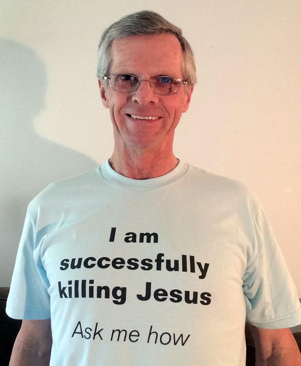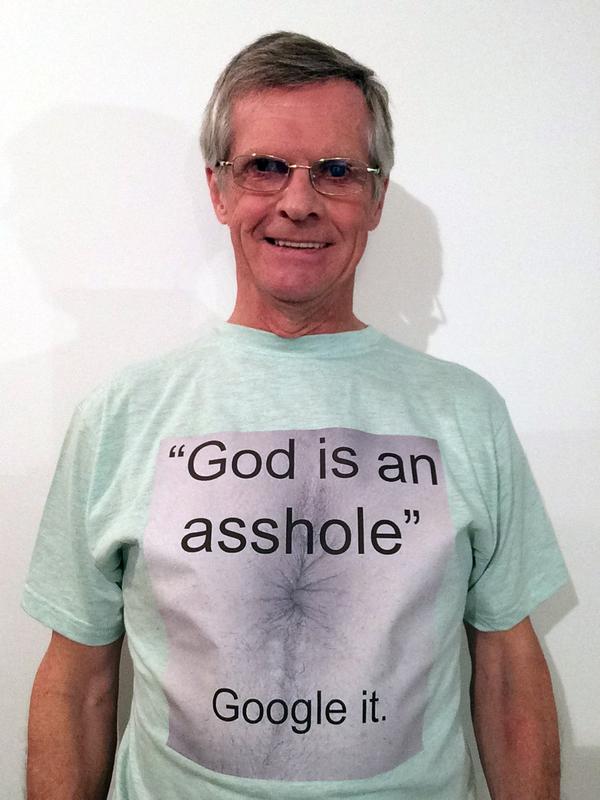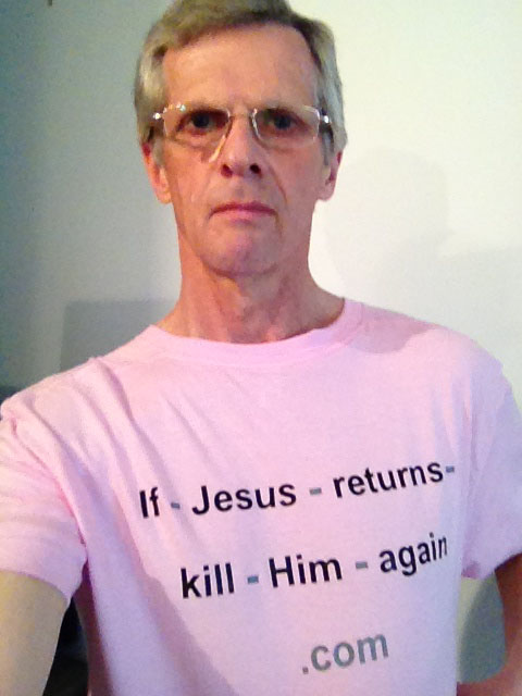 first came across Darwin Bedford on an image board. I didn’t know who he was, just a strange guy wearing a pink T-Shirt where you could read : « If Jesus returns, kill him again ». But Bedford was more than just a meme : I contacted him and found out he was an atheist activist in Canada, and that he called himself The Atheist Messiah. For years, he’s been creating dozens of low-tech websites to spread his words against Christianity, notably through essays such as Jesus is a no-show, the Pope is Humpty Dumpty, and Why god is siding with bin Laden. He even opened a zazzle shop to sell the T-shirts…
