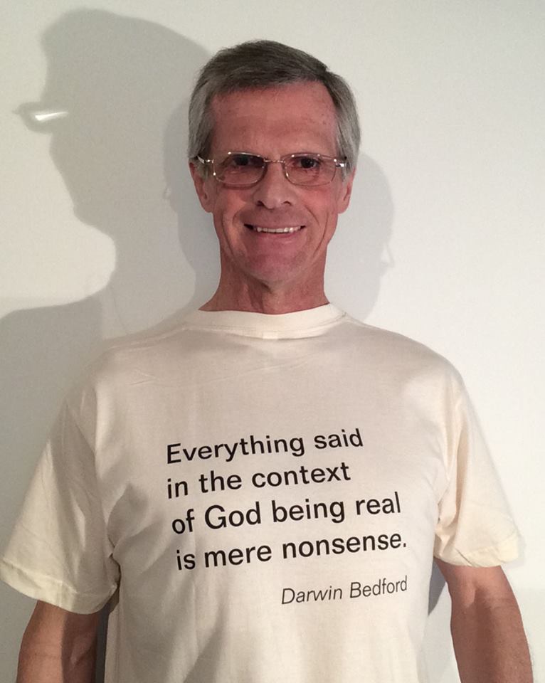 Darwin Bedford. I was given the name David in North Vancouver, Canada, where I was born in the middle of the previous century. Both my parents were real people, as opposed to supernatural beings–my mother an Anglican, my father an atheist. I didn’t really pay any attention to religion until I was confronted with the idea that people believed that a god was responsible for creating the world. I totally rejected the idea on the spot, in fact, I was very upset at the notion. I remember the incident clearly. I was walking home from a hike with my friend on a beautiful sunny day when my friend said “Isn’t it wonderful how God created the trees so green and the sky so blue.” I was 11 years old and this was the first time that I was presented with an explanation of how everything came into being.