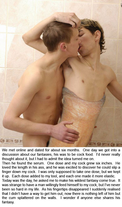 Je ne peux pas parler pour les autres, mais mon goût pour l’anal vore vient du plaisir que je ressens de me remplir l’estomac sans utiliser ma bouche, et en ayant les mains libres. Ne pas me servir de mes mains, ça me plaît beaucoup. Bien sûr, j’aime l’aspect très sexuel de l’anal vore. Je suis un homme, et je suis gay, donc forcément, je m’intéresse de près à tout ce qui touche à l’anus, et ça m’excite d’avoir un gros ventre après avoir avalé quelqu’un. C’est même ça qui est le plus important pour moi.